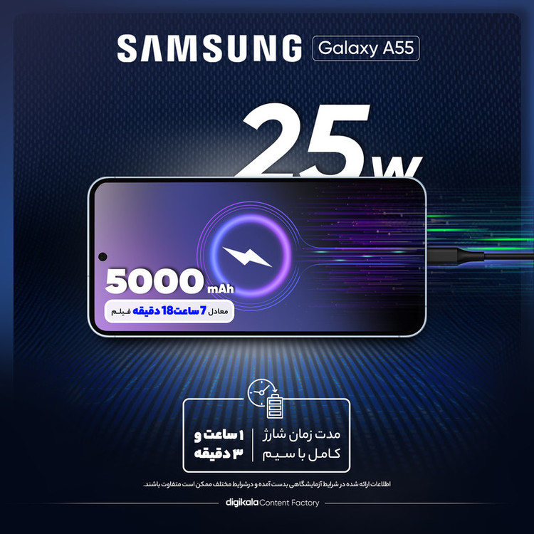 گوشی موبایل سامسونگ مدل Galaxy A55 نسخهی به روزشدهی میانردهی محبوب A54 محسوب میشود. این گوشی با بهرهمندی از نمایشگر 6.6 اینچی Super AMOLED با کیفیت با نرخ تازهسازی 120 فریم برثانیه یکی از بهترین نمایشگرهای میانرده را دارد. در بخش دوربین، رزولوشن 50 مگاپیکسلی و لرزشگیر اپتیکال تصاویر بسیار با کیفیتی ثبت میکند و باتری 5000 میلیآمپرساعتی آن به راحتی تا یک روز شارژدهی دارد. اما یکی از مهمترین پیشرفتهای این گوشی در بخش طراحی است و به قاب پشتی شیشهای و فریم آلومینیومی مجهز شده است که علاوه بر زیبایی، استحکام بسیار خوبی به آن بخشیده است. در مجموع، Galaxy A55 با همهی امکانات مناسبی که دارد توانسته است در مدت کمی به یکی از پرفروشترین میانردههای بازار تبدیل شده است.