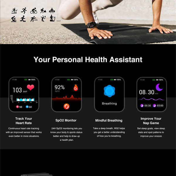 ساعت هوشمند آی می لب مدل IMILAB W02 دارای قابلیت های صفحه نمایش رنگی، صفحه نمایش لمسی، کنترل موسیقی (Music Player)، کنترل سطح اکسیژن خون، قابلیت مکالمه از طریق بلوتوث بند سیلیکون