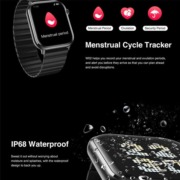 این ساعت بصورت مربعی طراحی شده که اندازه ی آن 1.85 اینچ است؛ ابعاد ساعت آیمی لب 11.25×38.14×44.14 میلی متر بوده و وزنی حدود 55 گرم (با بند) دارد. در قسمت کناری ساعت یک کلید ثابت و یک کلید چرخشی وجود دارد که به کمک آنها میتوانید بین منوهای ساعت جابجا شوید. همچنین یک بند 22 میلی متری مگنتی با کیفیت نیز روی این ساعت قرار گرفته است؛ یک بند سرمهای سیلیکونی نیز در بسته بندی ساعت وجود دارد. در هنگامی که ساعت را با بلوتوث به موبایل خود وصل کرده باشید، قادر خواهید بود که با IMILAB W02 به تماس تلفنی خود پاسخ دهید یا به انجام تماس تلفنی بپردازید. این ساعت یک صفحه نمایش 1.85 اینچی با رزولوشن 280 × 240 داشته که کیفیت بسیار بالایی را در اختیار شما قرار میدهد. روی صفحه از لایه محافظ شیشهای منحنی که بصورت 2.5D طراحی شده، پوشانده شده است. شرکت آی می لب واچ فیس های مختلفی را برای این ساعت معرفی کرده است. همچنین شما می توانید عکس خودتان را در پس زمینه ساعت قرار داده و یا میتوانید این واچ فیسها را بنا به سلیقه خود شخصی سازی کنید. این ساعت دارای قابلیت ردیابی 100 نوع حالت ورزشی مختلف را دارد که شامل دویدن، دوچرخه سواری، بدمینتون، تنیس، تنیس روی میز، کریکت، طناب زدن، بسکتبال، والیبال، بیسبال، راگبی، هاکی، رقص، یوگا، اسب سواری، اسکی فضایی، ورزشهای رزمی، تردمیل، دوچرخه ثابت، پیاده روی، نرمش و ... میشود که همگی به دقیق ترین حالت ممکن توسط ساعت جمع آوری شده و در اپلیکیشن نیز بصورت دقیقتر قابل مشاهده است. این ساعت دارای استاندارد مقاومت در برابر آب IP68 است که به معنای مقاوم بودن ساعت برابر آب و گرد و غبار است. اندازهگیری سطح اکسیژن خون، پایش کیفیت خواب، اندازهگیری سطح استرس، یادآوری دوره قاعدگی زنان، پایش 24 ساعته ضربان قلب از قابلییت های سلامتی این ساعت است. ساعت IMILAB W02 می تواند اس ام اس ها، تماس ها، زنگ آلارم، آب و هوا و سایر اطلاعات برنامه های اجتماعی را به موقع به شما یادآوری کند. همچنین با استفاده از این ساعت میتوانید موسیقی که روی گوشی تان پخش میشود را کنترل کنید. اپلیکیشن این ساعت GloryFit است و به راحتی از اپ استور و پلی استور قابل دانلود میباشد.