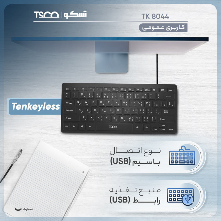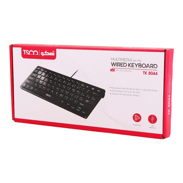 این کیبورد باسیم، با استفاده از درگاه USB، اتصالی پایدار و بدون تأخیر را ارائه میدهد و با طراحی ساده و عملکردی روان، کیبورد تسکو مدل TK 8044 نهتنها به عنوان یک ابزار کارآمد، بلکه بهعنوان یک همراه مطمئن در انجام وظایف روزمره شما ایفای نقش میکند. کیبورد تسکو مدل TK 8044 دارای 78 کلید اصلی است که با استفاده از سوئیچهای ممبران (Membrane Switch) طراحی شدهاند. وجود نشانگرهای LED کوچک برای وضعیت Num Lock و Caps Lock نیز به بهبود تجربه کاربری کمک میکند و اطلاعات ضروری را بهصورت واضح و کاربردی نمایش میدهد. این طراحی بدون پیچیدگی، علاوه بر حفظ ظاهری شیک و حرفهای، مصرف انرژی را کاهش داده و تمرکز کاربر را روی وظایف اصلی حفظ میکند. این کیبورد از طریق یک کابل 1.8 متری با درگاه USB به سیستم متصل میشود. اتصال باسیم تضمین میکند که دستگاه بدون هیچگونه تأخیر یا قطعی عمل کند، که این ویژگی برای کاربرانی که نیاز به عملکرد پایدار دارند، یکی از نقاط قوت این محصول، سازگاری گسترده آن با انواع سیستمعاملها از جمله Windows، Linux، Android، Unix و MacOS است. این ویژگی به کاربران امکان میدهد تا دستگاه را بهراحتی به انواع کامپیوترها، لپتاپها، تبلتها و حتی برخی دستگاههای هوشمند متصل کنند. کیبورد تسکو مدل TK 8044 با دوام بالا طراحی شده است تا بتواند نیازهای کاربران را برای مدت طولانی برآورده کند. کلیدهای مقاوم و سوئیچهای باکیفیت آن، عملکردی قابلاعتماد ارائه میدهند. این محصول بهویژه برای افرادی که به دنبال یک دستگاه اقتصادی اما باکیفیت هستند، گزینهای مناسب است. کیبورد تسکو مدل TK 8044 به دلیل طراحی کوچک و فشرده خود، برای دانشآموزان، کارمندان، و حتی افرادی که به دنبال یک کیبورد مسافرتی هستند، بسیار کاربردی است. قابلیت اتصال آسان و بدون نیاز به نرمافزار اضافی، استفاده از آن را حتی برای کاربران مبتدی ساده و راحت کرده است.