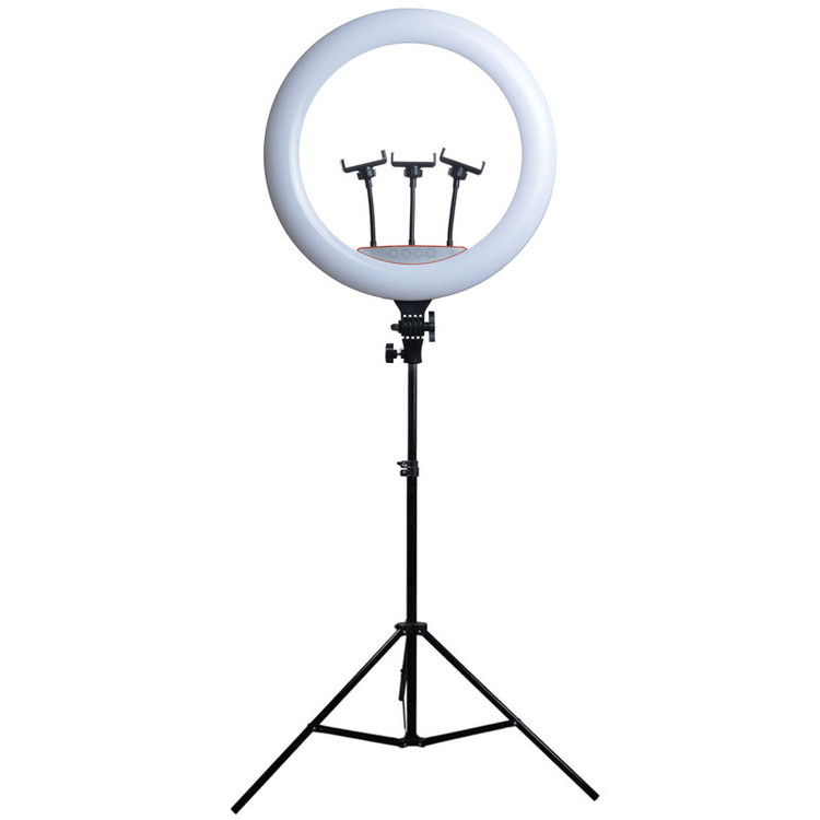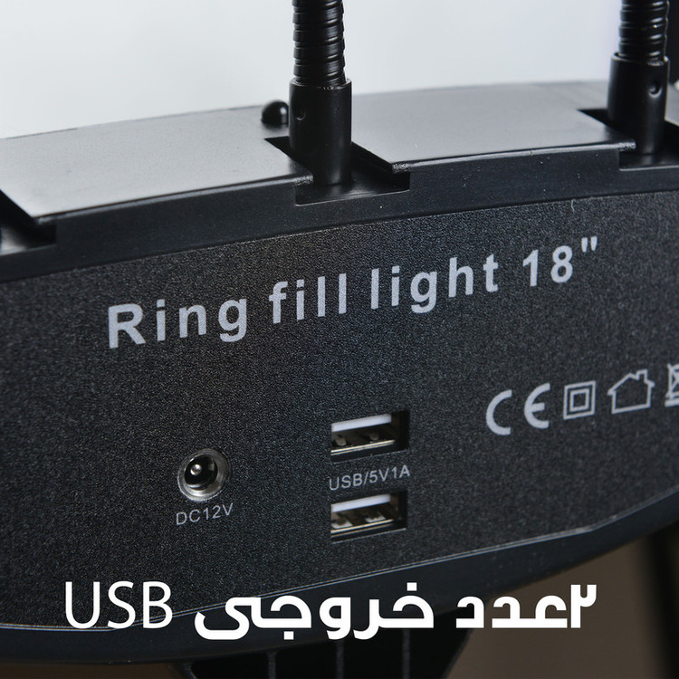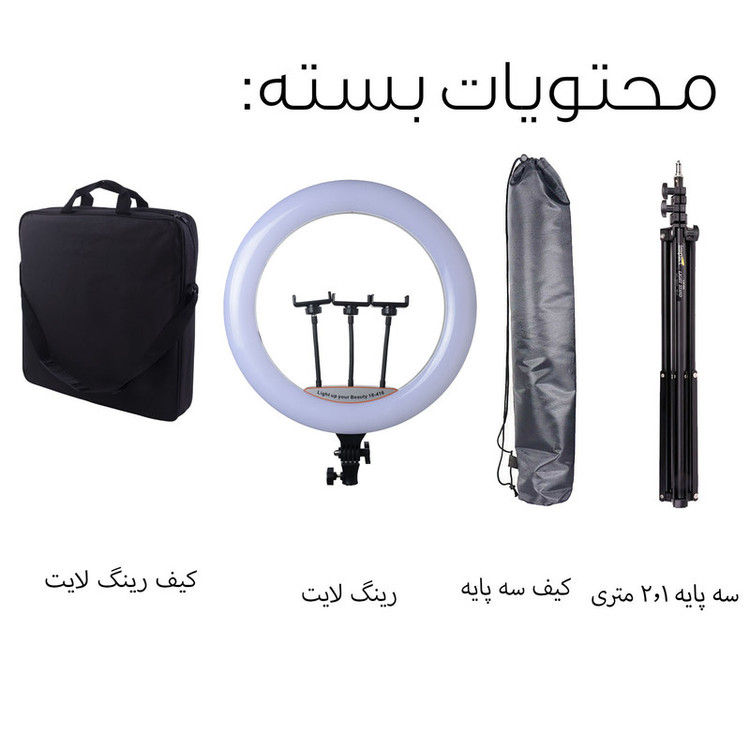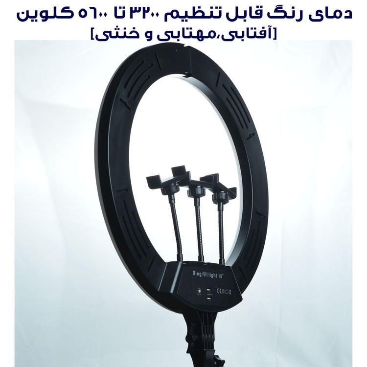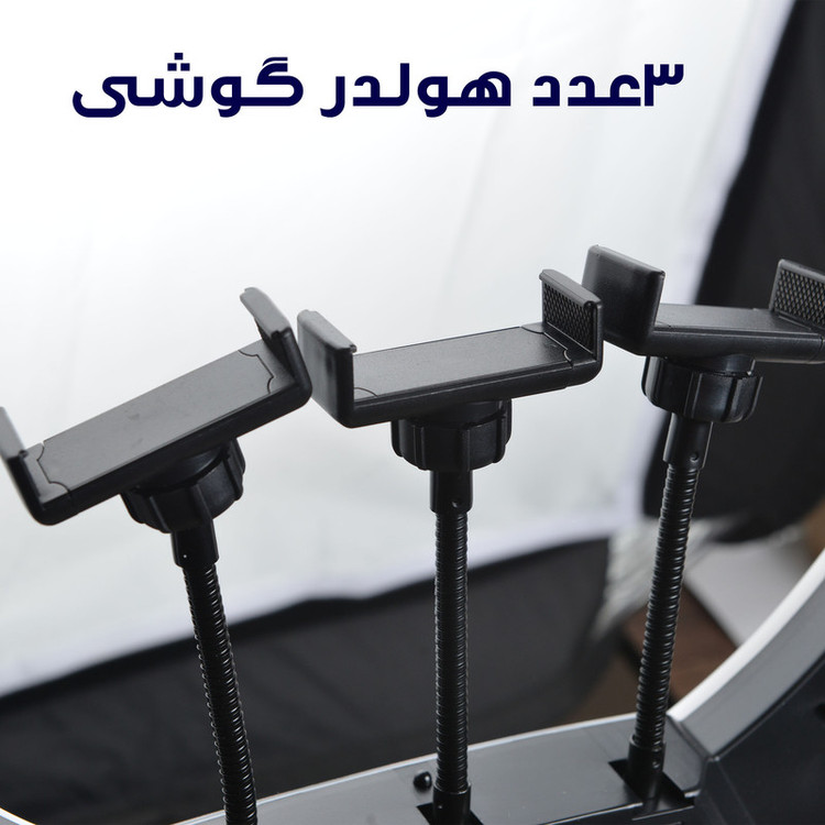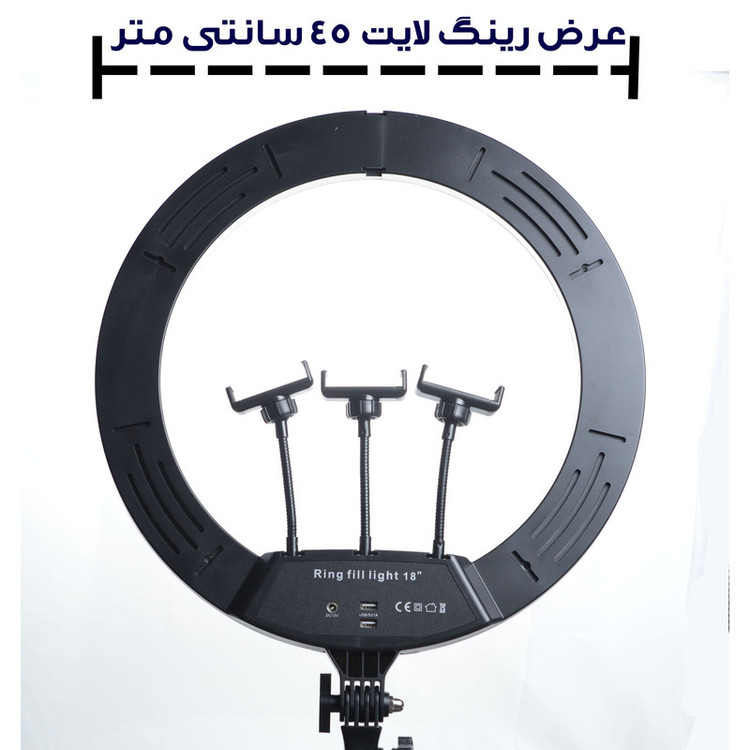 اندازه خارجی دایره 45 سانتی متر دارای کیف حمل و کیسه 3 پایه. حداکثر ارتفاع 3 پایه 210 سانتی متر دمای نور قابل تنظیم از 3200کلوین تا 5600 کلوین.(آفتابی ، مهتابی و خنثی) دارای 3 عدد هولدر گوشی