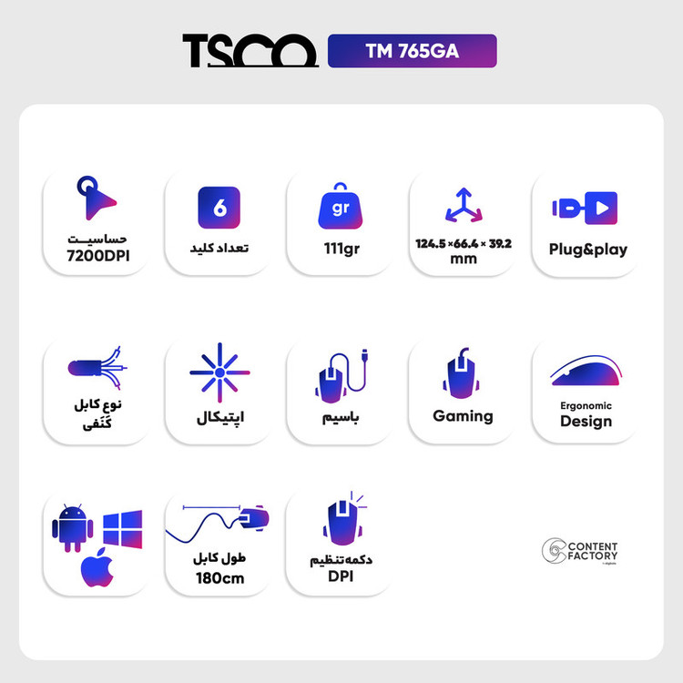 ماوس مخصوص بازی تسکو مدل TM 765GA یکی از تولیدات برند تسکو است. این برند ایرانی معروف محصولات متنوعی از جمله لوازم جانبی کامپیوتر را تولید میکند. بیش از دو دهه از آغاز فعالیتهای برند تسکو میگذرد و در این مدت محصولات این برند توانستهاند نظر بخش قابلتوجهی از مشتریان را به دست بیاورد. این مدل ماوس برند تسکو هم به دلیل قیمت مناسب و ویژگیهای خوبی که دارد، جزو یکی از محصولات پرفروش این شرکت محسوب میشود. ماوس مذکور توسط رابط USB به کامپیوتر و لپتاپ متصل شده و با سیم کار میکند. محدوده دقت این ماوس حدود 3200 است. به همین دلیل برای انجام کارهای روزمره با کامپیوتر انتخاب بسیار خوبی به نظر میرسد. همچنین در ساخت این مدل ماوس از حسگر اپتیکال استفاده شده است. ماوسهایی با این ویژگی به دلیل حساسیت زیادی که نسبت به حرکت دارند از دقت بالایی برخوردار هستند. از دیگر ویژگیهای این مدل ماوس میتوان به طراحی بسیار خاص و منحصربهفرد و وزن مناسبش اشاره کرد.